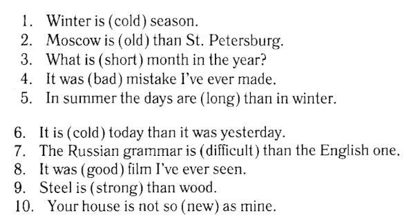 Поставьте прилагательные в скобках в нужную форму. Напишите номер предложения и прилагательное. В одном предложении прилагательное останется в положительной степени, т.е. без изменения. Переведите предложения на русский язык.