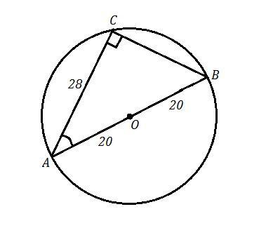 Помогите срочно даю 25 балов!!!!!! Радиус окружности 20 см. Найти косинус угла между диаметром АВ и хордой АС длина которой 28 см На Украинском: (Радіус кола 20 см. Знайти косинус кута між діаметром АВ і хордою АС довжина якої 28 см)