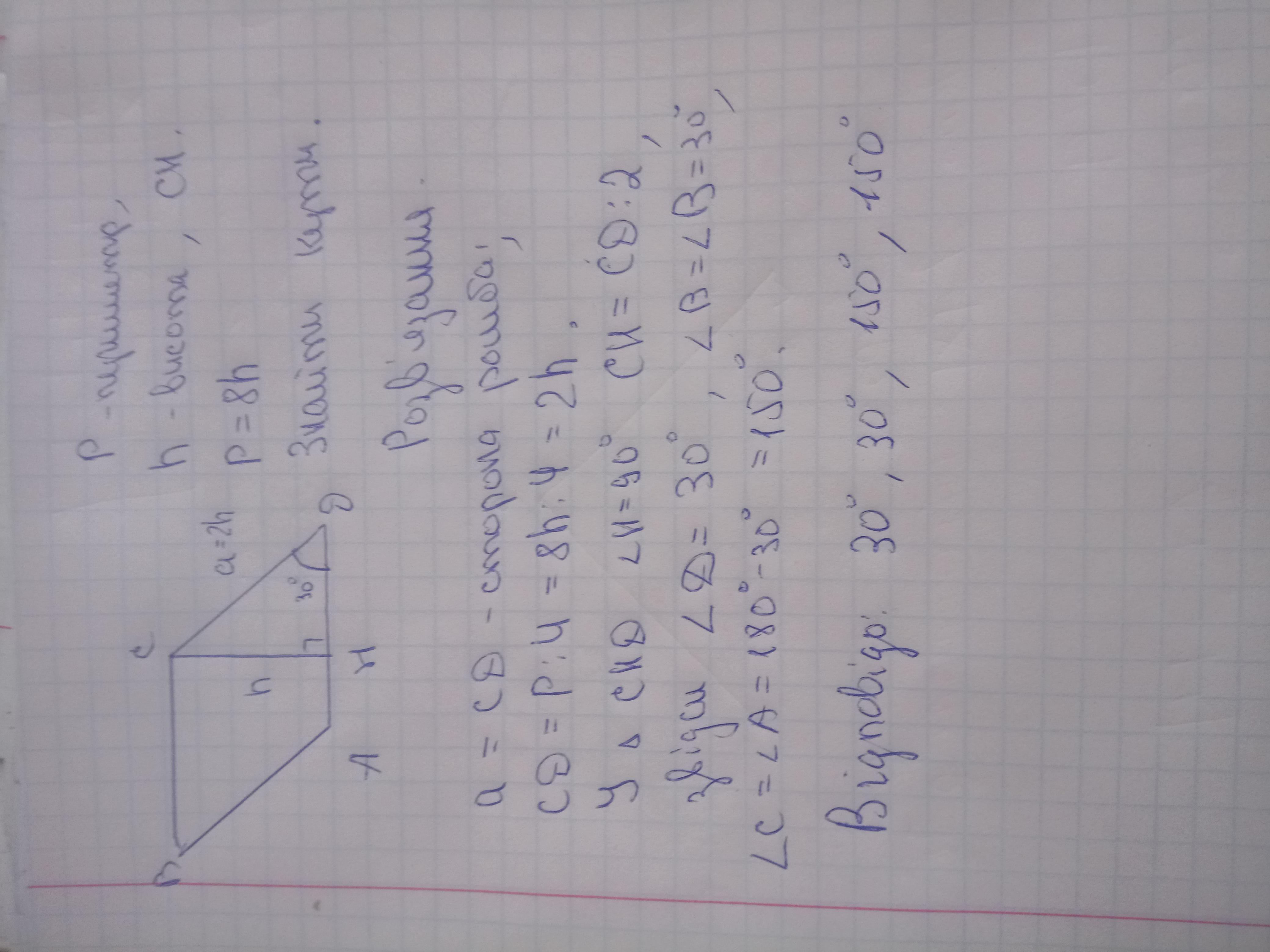 Висота ромба у 8 разів менша від його периметра. Визначити