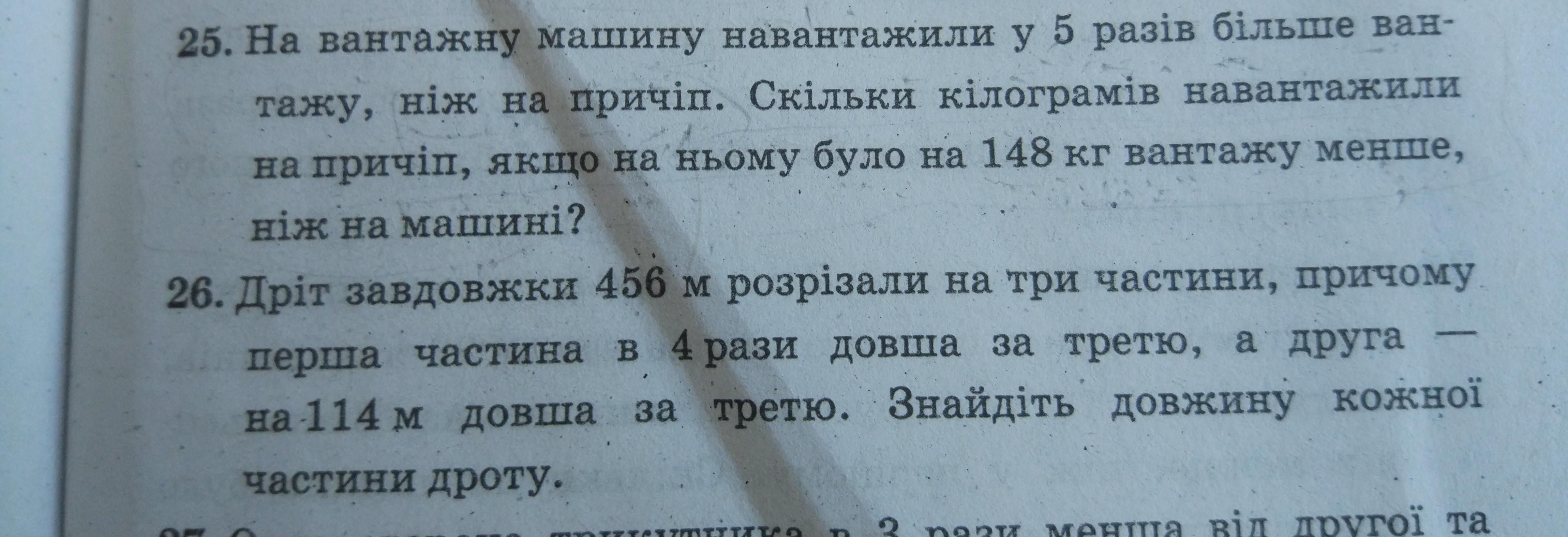 25. Нехай на причіп навантажено х, тоді на машину 5х. З іншого боку на машину навантажили на 148 кг більше, тобто х+148. Тому на машину навантажили 5х=х+148