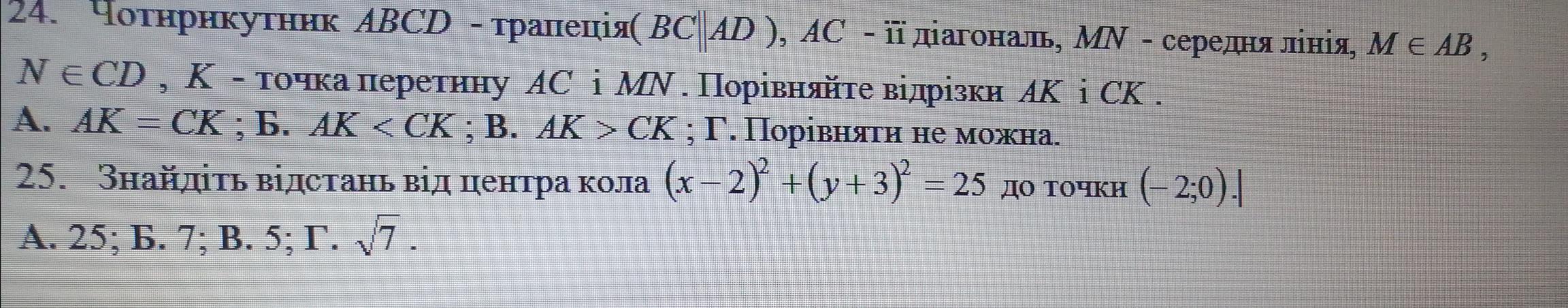 24) Средняя линия трапеции является и средней линией треугольника АВС. Точка К на АС делит её пополам.