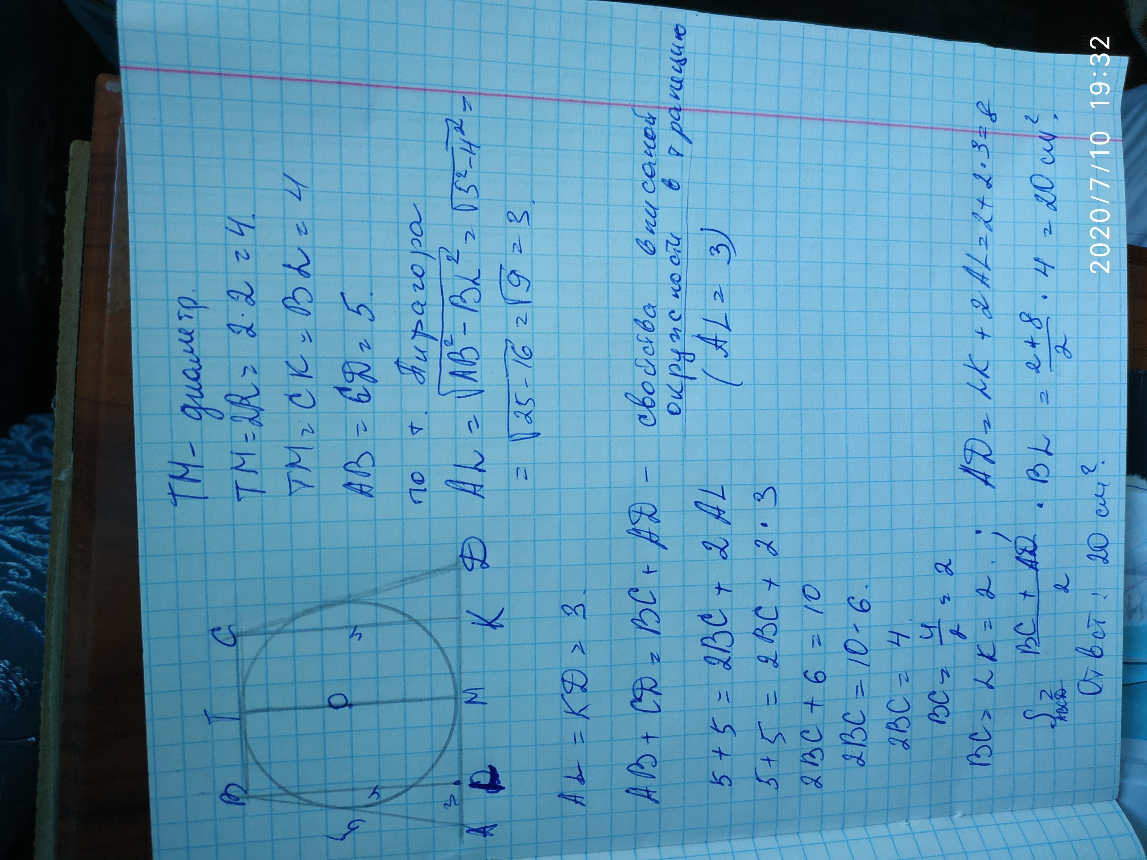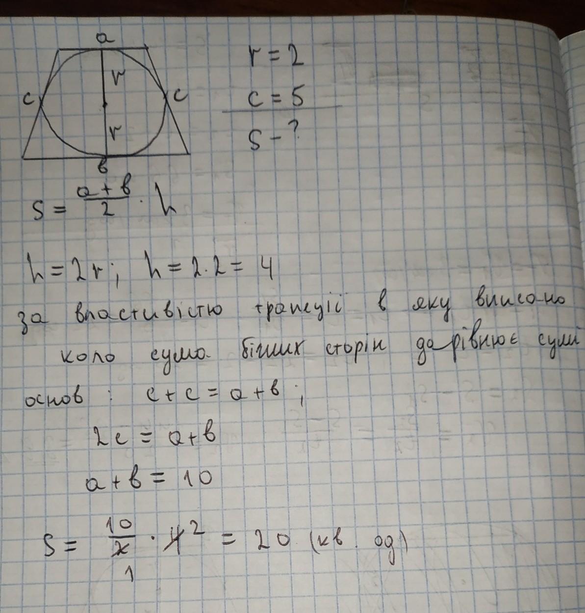 Навколо кола описана рівнобічна трапеція. Знайдіть її площу, якщо радіус кола дорівнює 2, а довжи на бічної сторони дорівнює 5.
