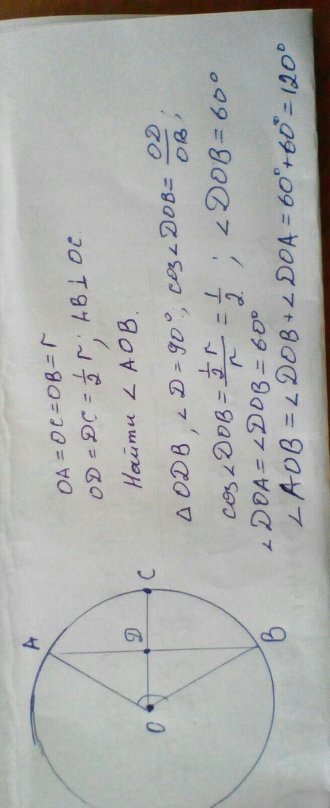 В окружности с центром О через середину радиуса проведено хорду АВ, перпендикулярную к нему. Найдите угол АОВ