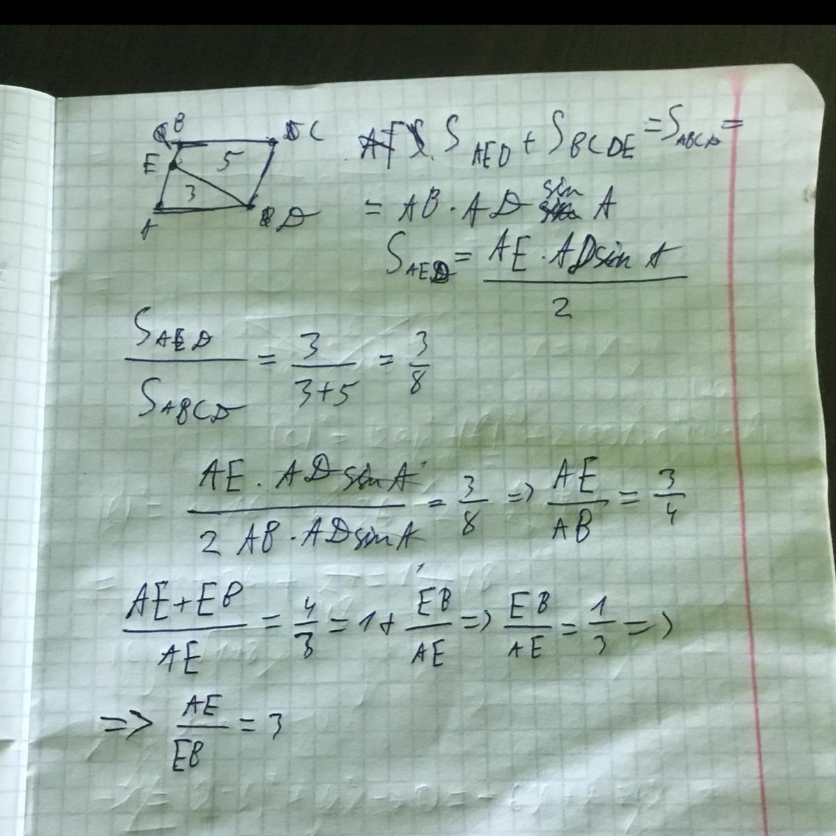 В параллелограмме ABCD угол D − тупой. Точка E лежит на стороне AB. Если площадь четырехугольника BCDE относится к площади треугольника DAE соответственно как 5:3, то найдите отношение AE:EB