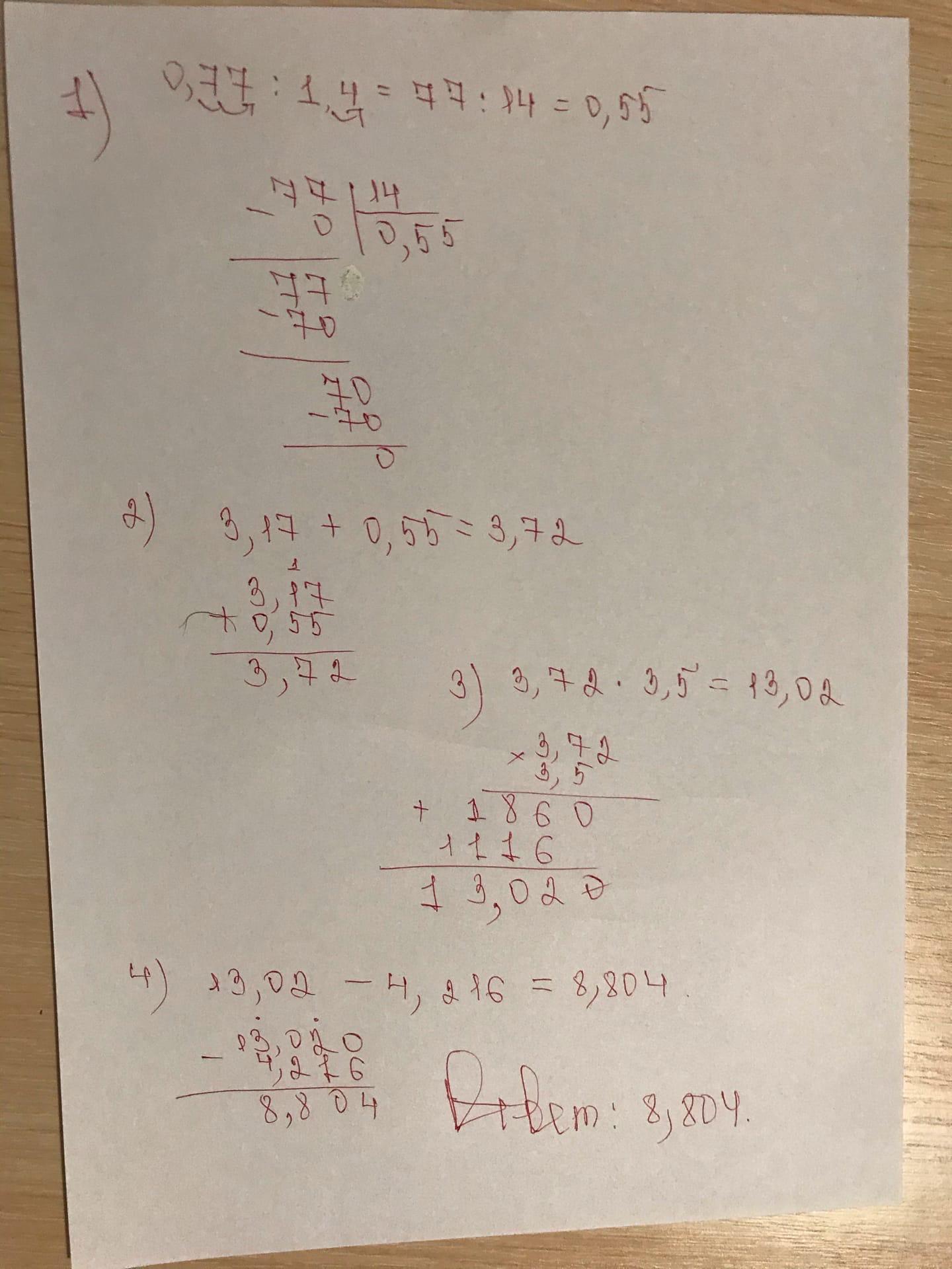 (3,17+0,77:1,4)*3,5-4,216 = 11,095+1,925-4,216 = 13,02-4,216 = 8,804