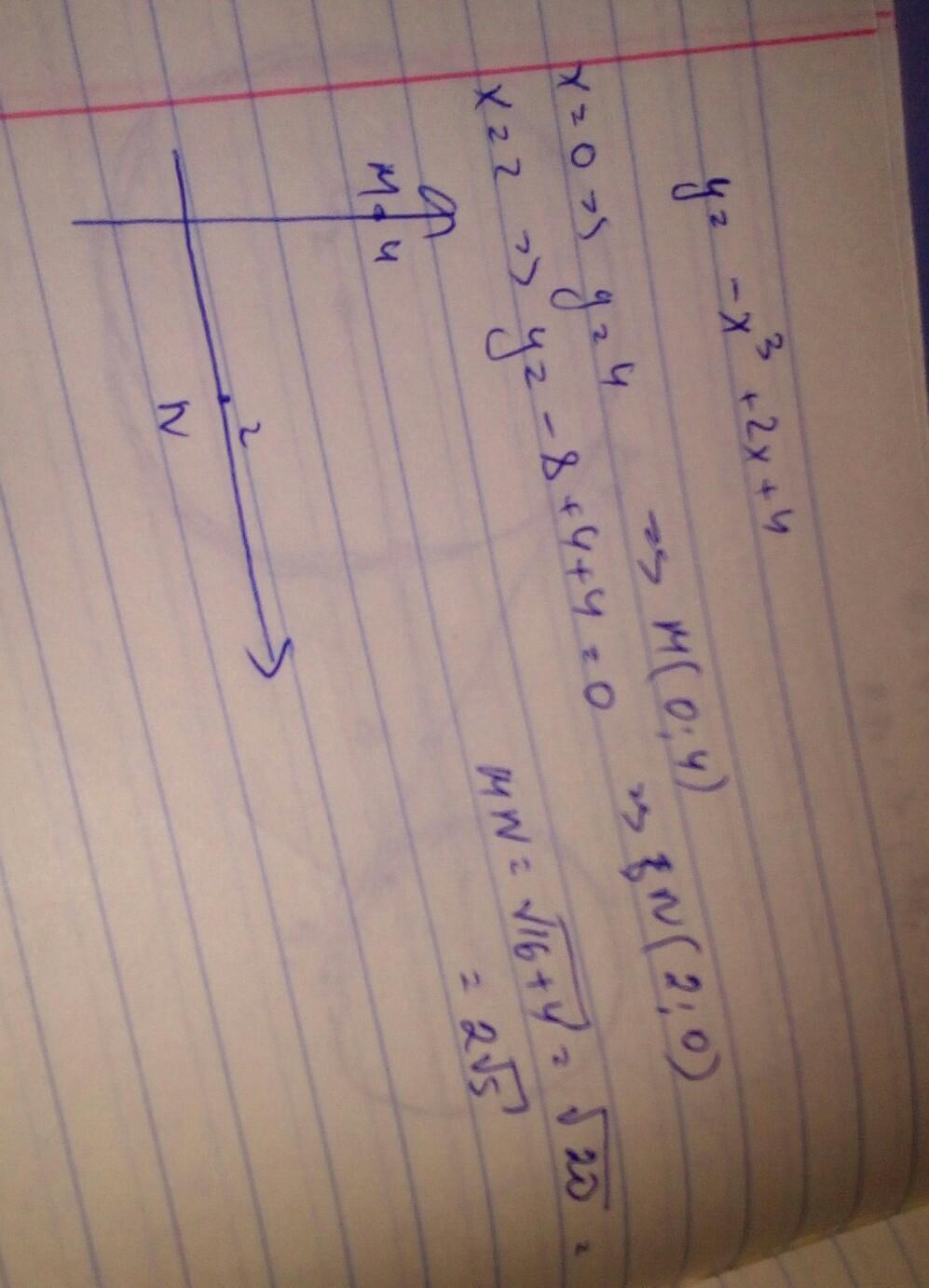 Ответ: для х=0 имеем у=4, для х=2 имеем у=-8+4+4=0. Расстояние между точками равно единиц.