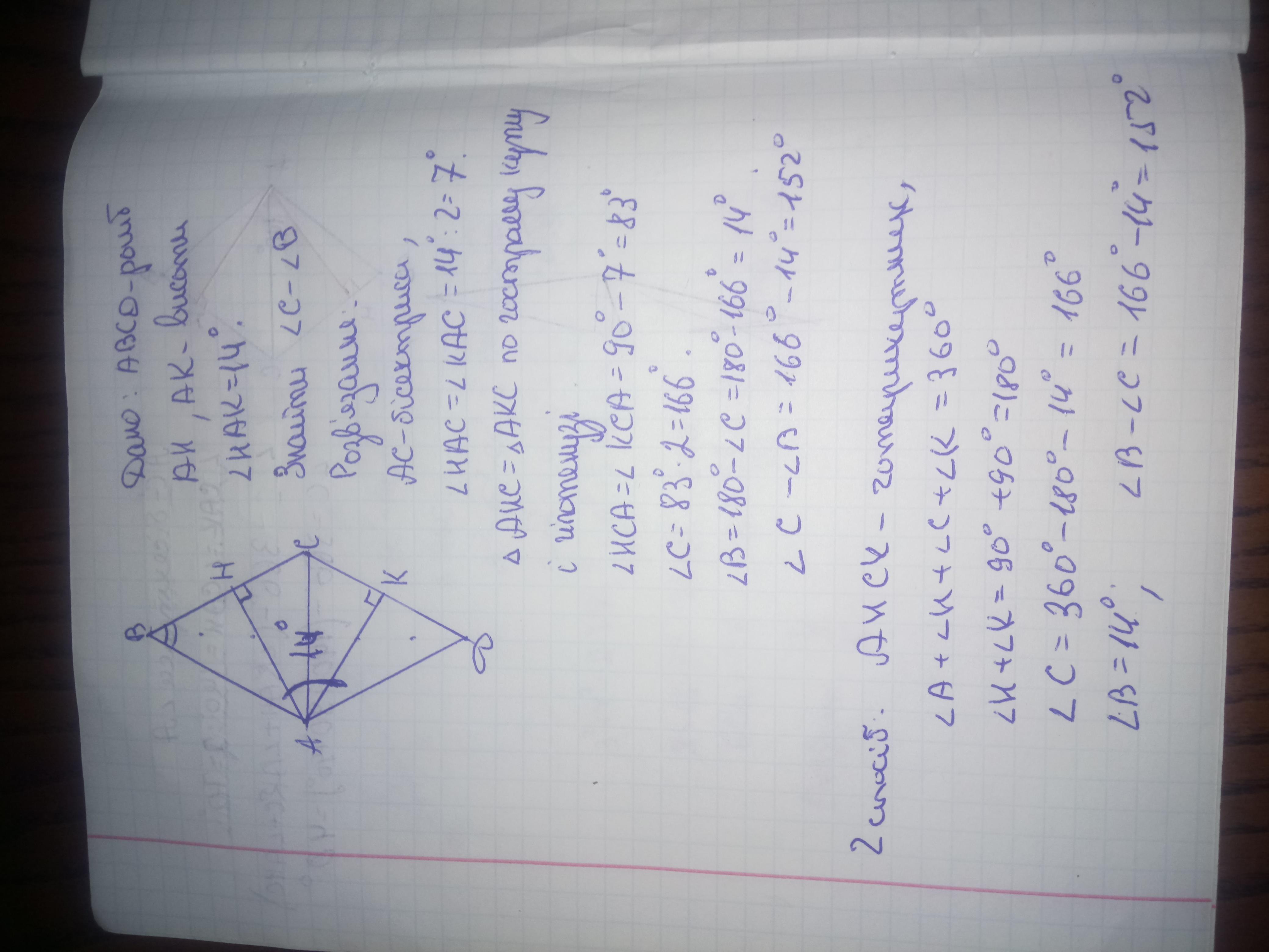 Висоти проведені з вершини тупого кута ромба,утворюють між собой кут 140.Знайдіть різницю тупого і гострого кутів ромба