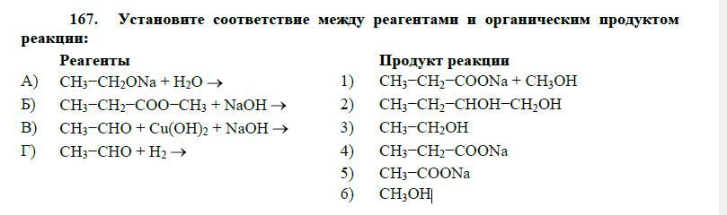 ПОМОГИТЕ ПОЖАЛУЙСТА С ХИМИЕЙ Установите соответствие между реагентами и органическим продуктом реакции: Реагенты Продукт реакции A) СН3−CH2ONa + Н2O 1) СН3−СН2−COONa + CH3OH Б) СН3−СН2−СОО−СН3 + NaOH 2) СН3−СН2−СНОН−СН2ОН B) СН3−СНО + Сu(ОН)2 + NaOH 3) СН3−СН2ОН Г) СН3−СНО + H2 4) СН3−СН2−СООNa 5) СН3−СООNa 6) CH3OH