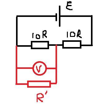 Напряжение, которое показывает вольтметр в первом случае (R' - сопротивление самого вольтметра)