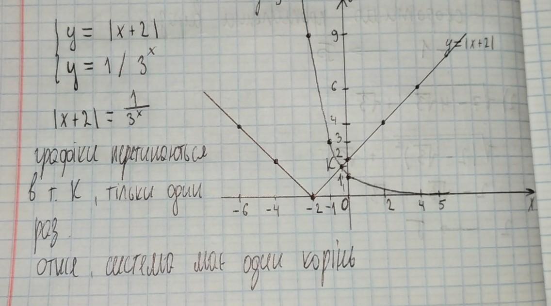 3^(-x) -|x+2| = 0 имеет единственное решение, которое лежит на промежутке x∈(-1;0), как и представленная система уравнений.