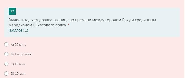 Средний меридиан III часового пояса 37,5° или 37°30'. Баку находится 40°21'. Разница между ними 40°21'-37°30'=2°51'. 2°51'=11 минут 24 секунды ≈ 10 минут