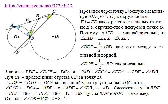 Две окружности касаются внешним образом в точке D. Прямая касается одной окружности в точке A и пересекает другую в точках B и C (точка B лежит между точками A и C). Известно, что ∠BDC=12∘. Чему равен ∠ADB?