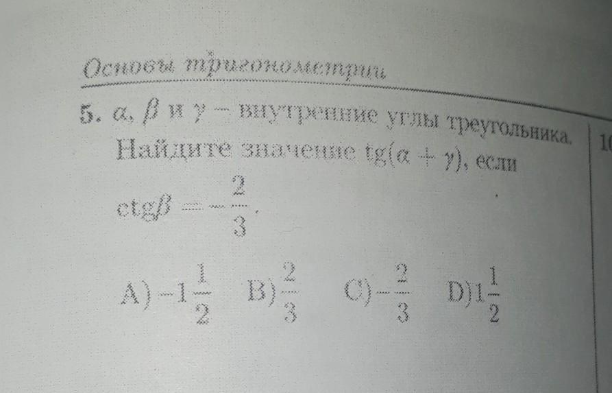 з5) a, b, y - внутренние углы треугольника . Найдите значение tg(a +y) , если ctgb= -2/3