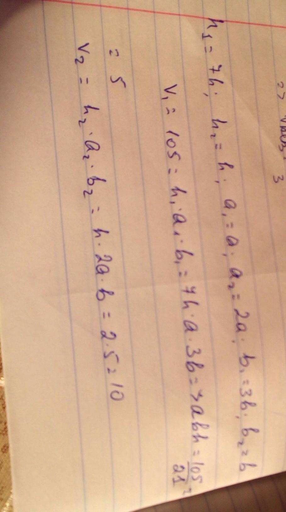 Объем первого прямоугольного параллелепипеда равен 105. Найдите объем второго прямоугольного параллелепипеда, если известно, что высота первого параллелепипеда в 7 раз больше высоты второго, ширина второго в 2 раза больше ширины первого, а длина первого в 3 раза больше длины второго.