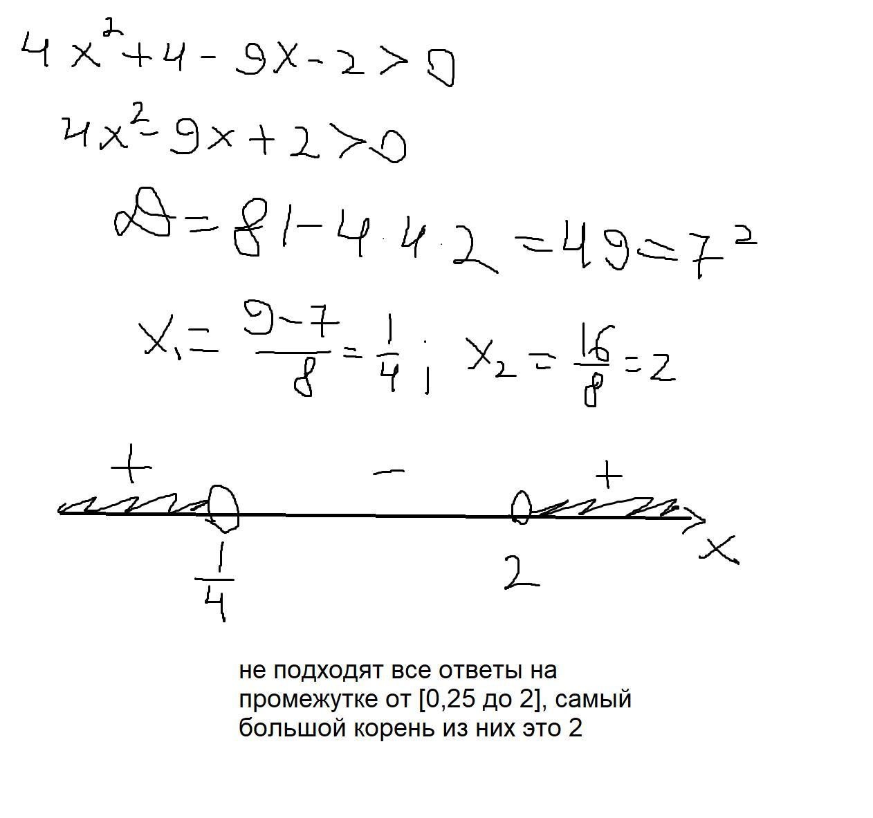 но в условии требуется найти наибольшее значение x не являющееся решением неравенства, этот промежуток [1/4; 2].