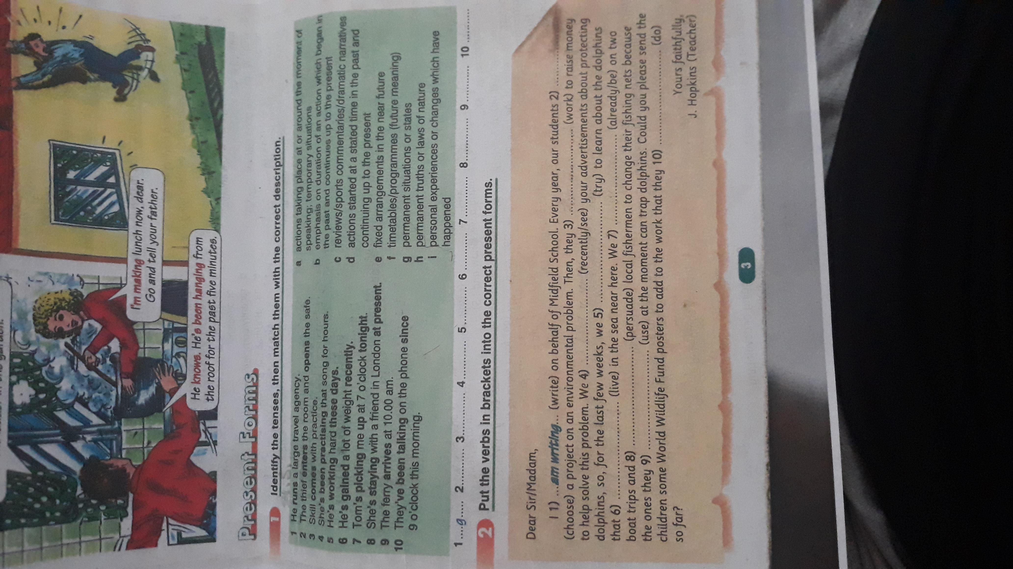 I 1. am writing on behalf of Midfield school. Every year, our students 2. choose a project on an environmental problem. Then, they 3. work to raise money to help solve this problem. We 4. have recently seen your advertisements about protecting dolphins, so, for the last few weeks, we 5. have been trying to learn about the dolphins that 6. live in the sea near there. We 7. have already been on two boat trips and 8. have persuaded the local fishermen to change their fishing nets because the ones they 9. are using at the moment can trap dolphins. Could you please send the children some World Wildlife Fund posters to add to the work that they 10. have done so far?