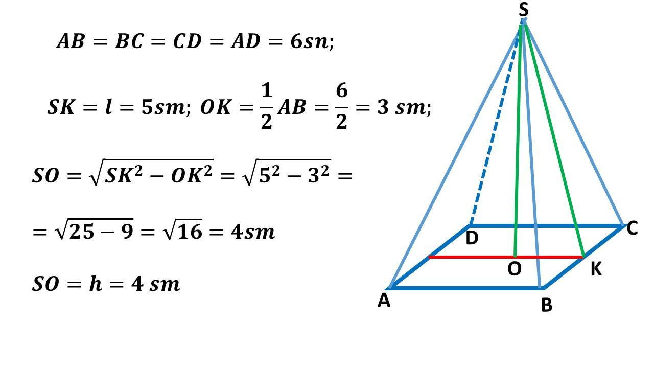 ПОМОГИТЕ СРОЧНО В правильной четырехугольной пирамиде сторона основания 6см а апофема 5см.Найти высоту пирамиды