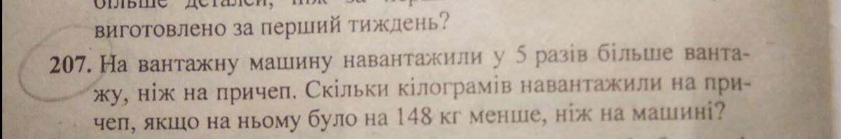 Нехай на причепі х кг вантажу. Тоді на вантажній машині буде 5х кг вантажу, та і 148+х кг вантажу.