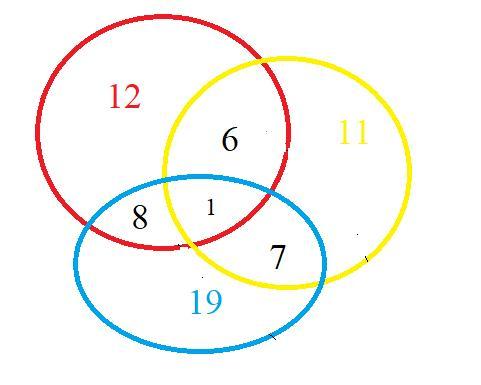 В универмаге нарядили несколько новогодних ёлок. На 12 из них есть красные шары, на 11 — жёлтые, на 19 — синие, на 6 — красные и жёлтые, на 8 — красные и синие, на 7 — жёлтые и синие, а на одной — шары всех трёх цветов. Сколько ёлок нарядили в универмаге?