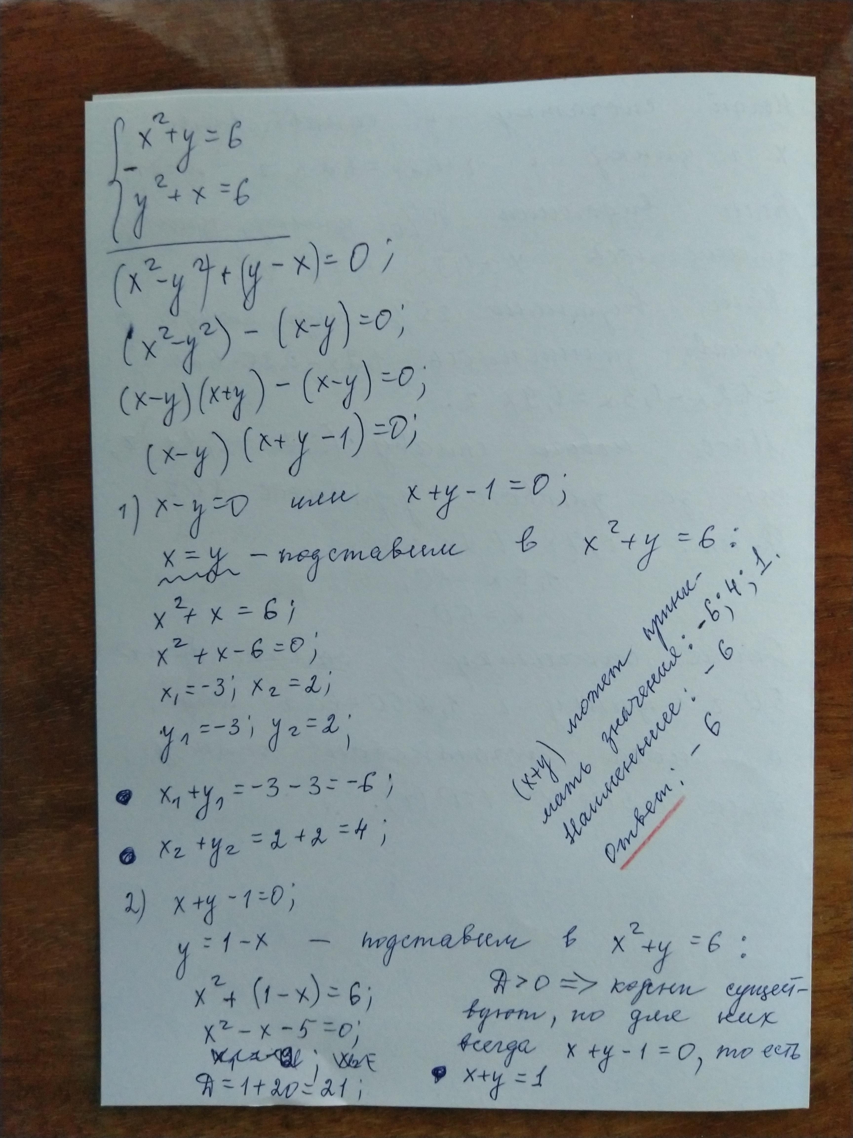 Даю 50 баллов.Решите 2 задания, пожалуйста 1.Найдите произведение ху из системы ₍y^2-3xy+x^2-x+y+9=0 ₍y-x=2 2.Найдите наименьшее значение х+у из системы ₍x^2+y=6 ₍y^2+x=6