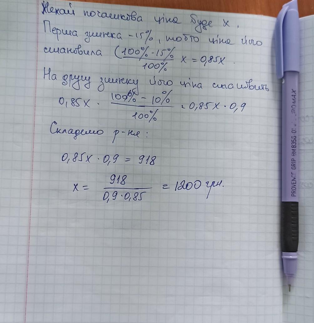Після двох послідовних зниень ціни, перше з яких було на 15%, а друге— на 10%, пальто стало коштувати 918 грн. Якою була початкова ціна пальта?