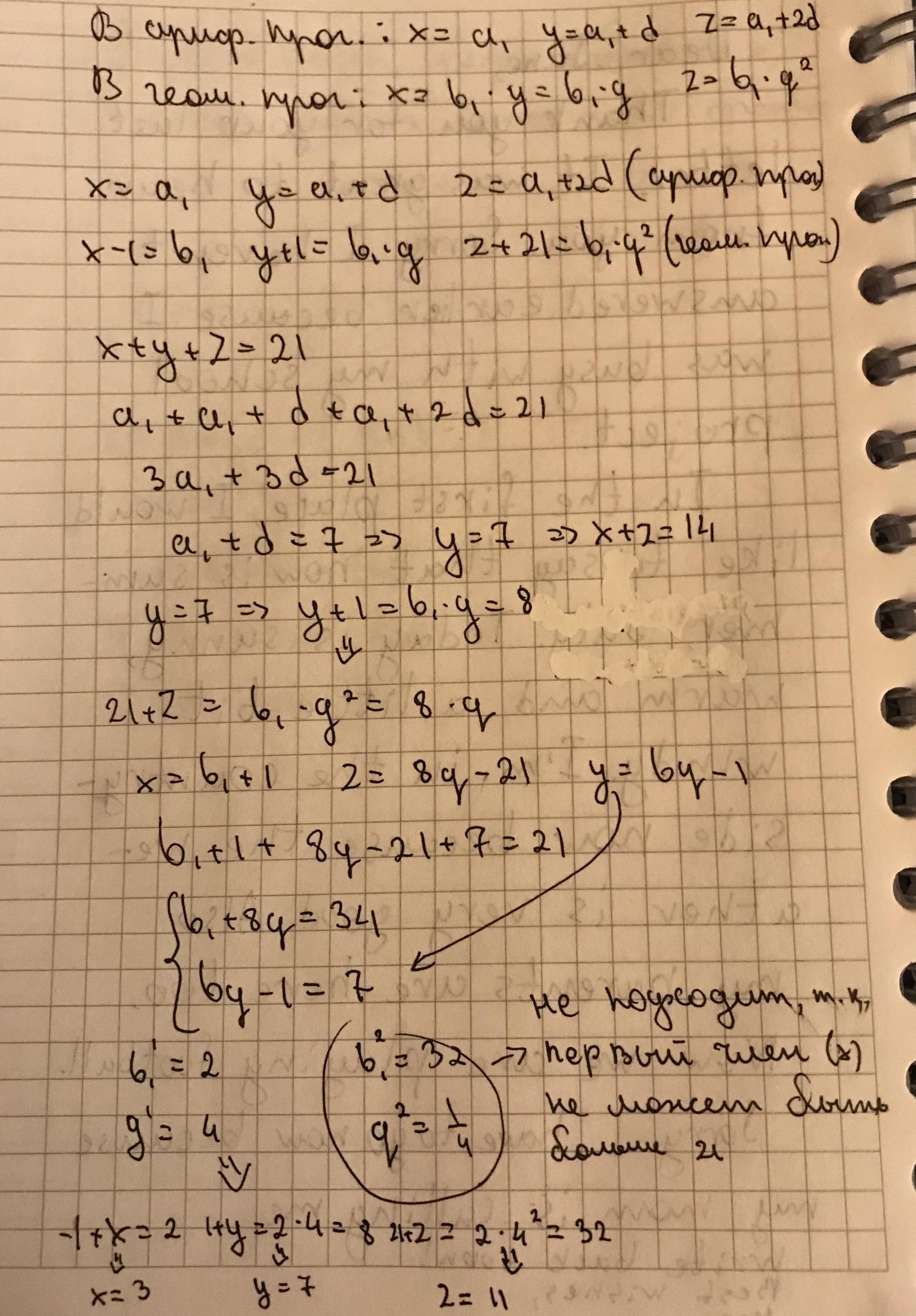Числа x,y,z - последовательные члены арифметической прогрессии, их сумма равна 21. Числа x-1, y+1, z+21 являются последовательными членами некоторой геометрической прогрессии. Найдите числа x,y,z.
