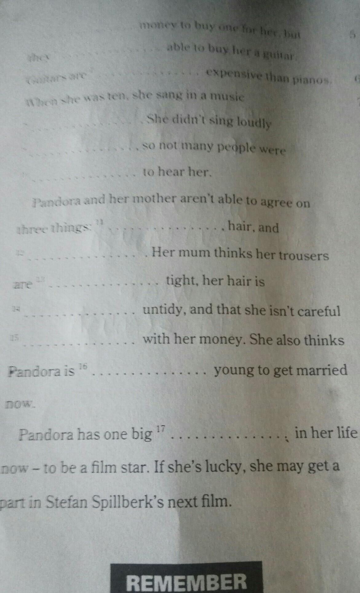 Pandora and her mother aren't able to agree on three things: trousers, hair, and money. Her mum thinks her trousers are too tight, her hair is untidy, and that she isn't careful with her money. She also thinks that Pandora is too young to get married now.
