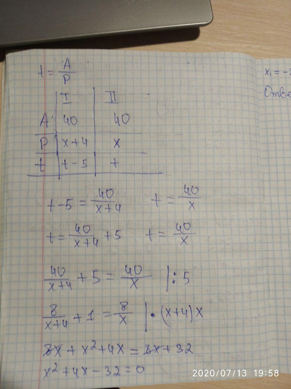 первый рабочий делает 40 деталей на 5 часов быстрее чем второй. сколько делатей в час делает второй рабочий, если известно, что первый за час делает на 4 детали больше?