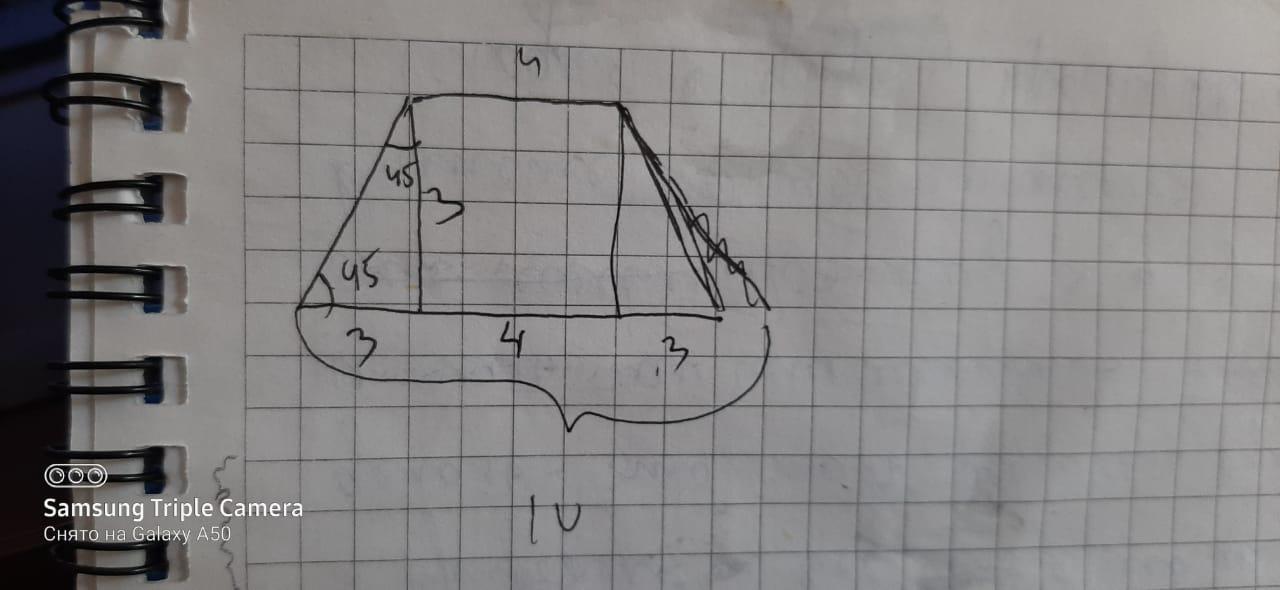 т.к. это равнобедренная трапеция то в большем основании такие деления: 3, 4, 3. а раз угол равен 45 градусам, то и высота равна 3.(на картинке)