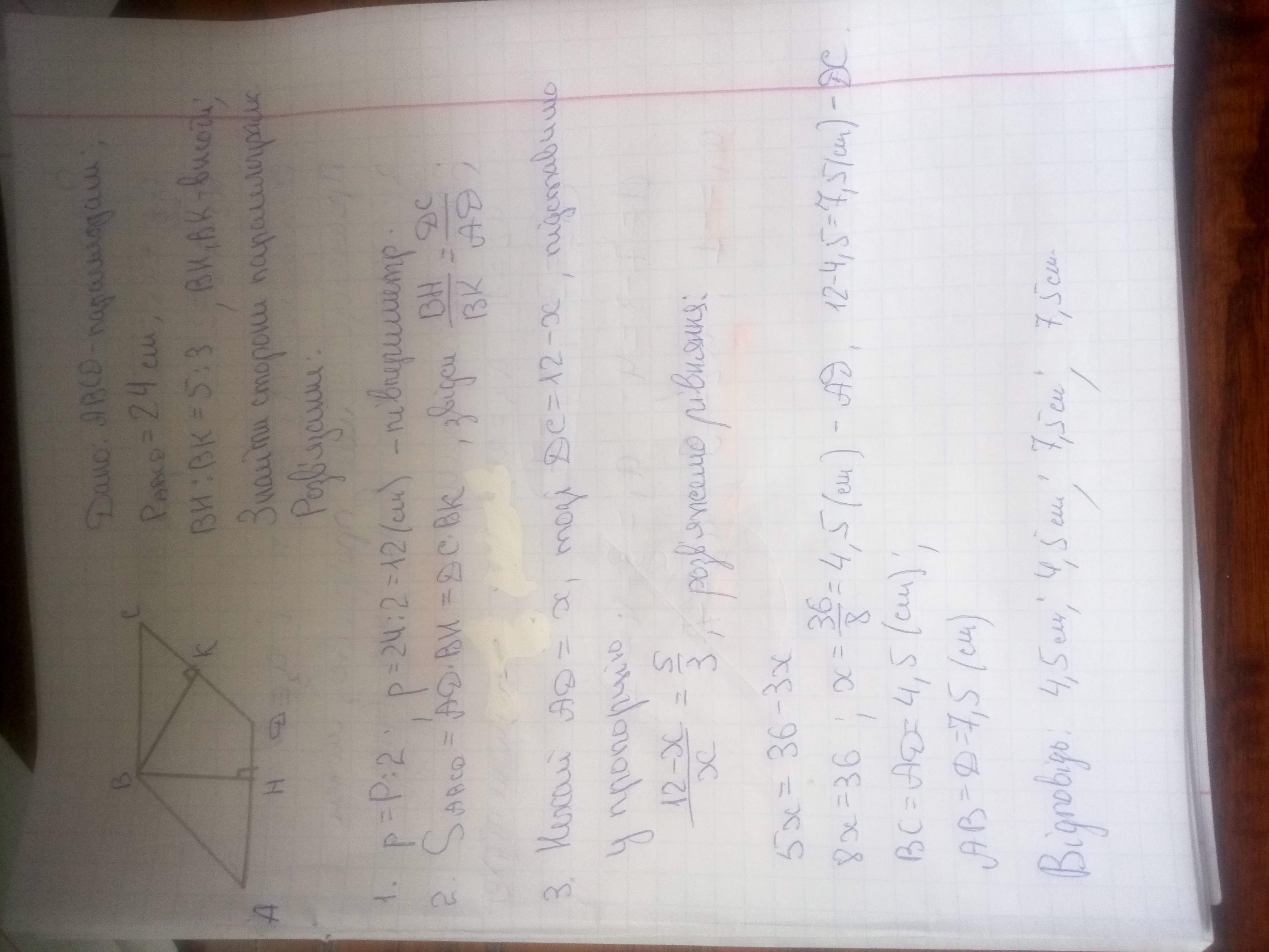 Периметр паралелогоама дорівнює 24см а його висоти відносяться як 5:3 знайдіть сторони паралелограма срочно с картинкой