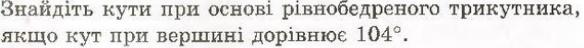 1) Поскольку у равнобедренного треугольника углы при основании = то они = (180-104):2=38°(по свойству суммы внутренних углов треугольника).