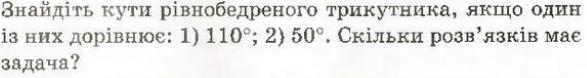 2.1) Если 1 из углов = 110° то это точно угол при вершине так как если бы он был при основании то сумма 2х углов при основании была бы >180, а такого треугольника не существует. Значит это угол при вершине треугольника и значит углы при основании = (180-110):2=35°(по свойству суммы внутренних углов треугольника).