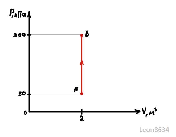 На PV диаграмме изображающая точка, двигаясь прямолинейно, переместилась из положения А(50000 Па; 2м3) в положение В(300000Па; 2м3). Какую работу совершил газ? Помогите, пожалуйста, решить задачу с подробным ответом.