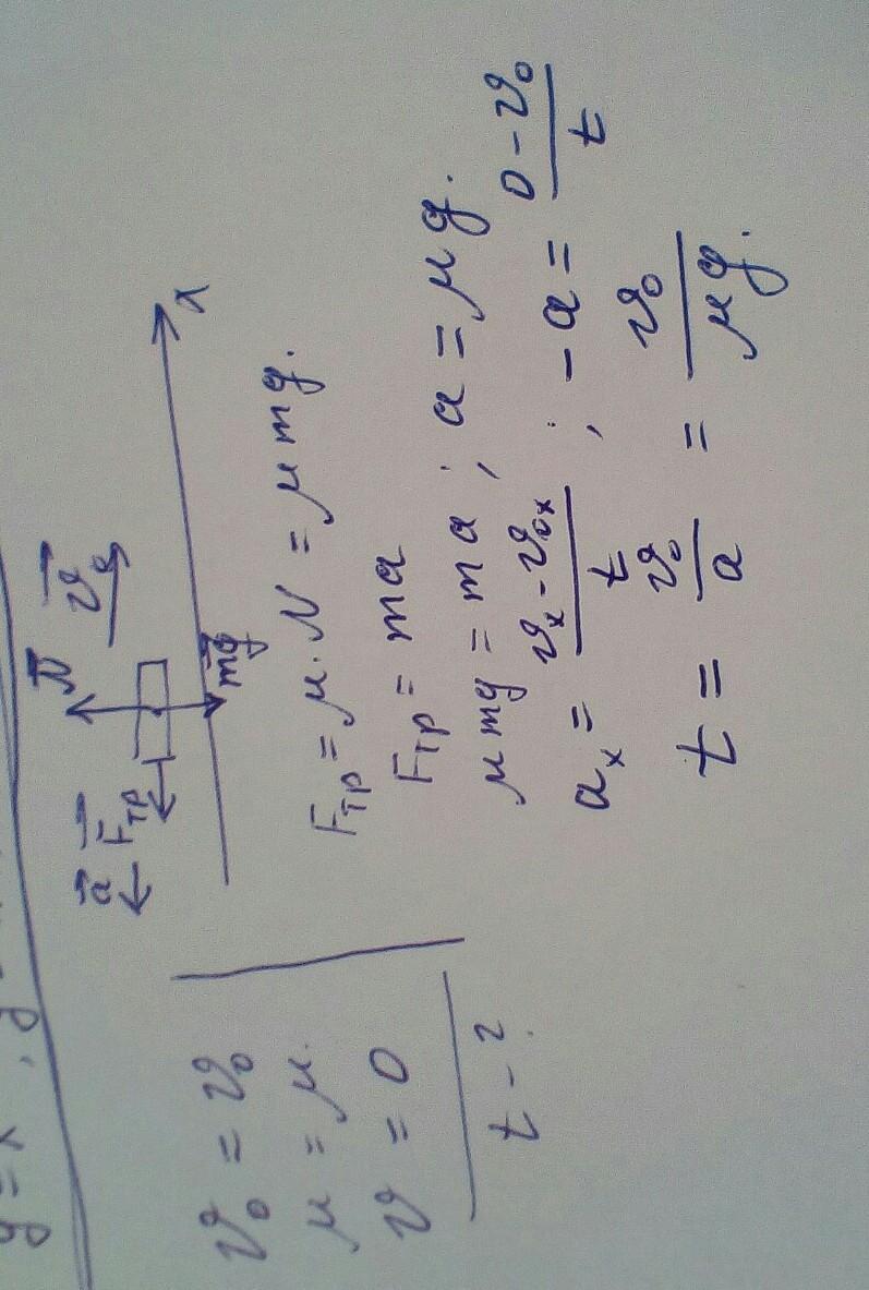 Чему равно время остановки санок на горизонтальной дороге под действием силы трения, если начальная скорость санок υ₀, а коэффициент трения - μ? 1. μgυ₀ 2. υ₀/μg 3. μg/υ₀ 4. mυ₀/μg С объяснением, если не затруднит