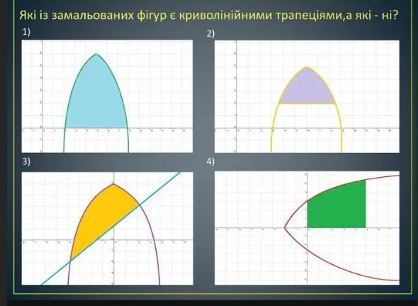 Криволине́йная трапе́ция — плоская фигура, ограниченная графиком неотрицательной непрерывной функции, определенной на отрезке [a; b], осью абсцисс и прямыми . Значит КРИВОЛИНЕЙНЫМИ будут 1 и 4
