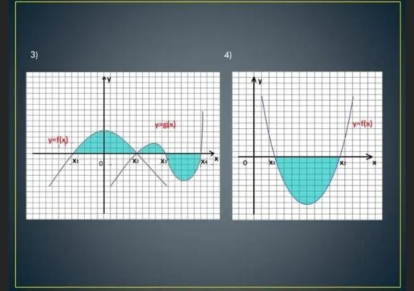 1фото) общая площадь=∫ f(x)dx+∫ g(x)dx+∫ (-f(x))dx Пределы 1 интеграла от х1 до х2 , второго от х2 до х3 , третьего от х3 до х4