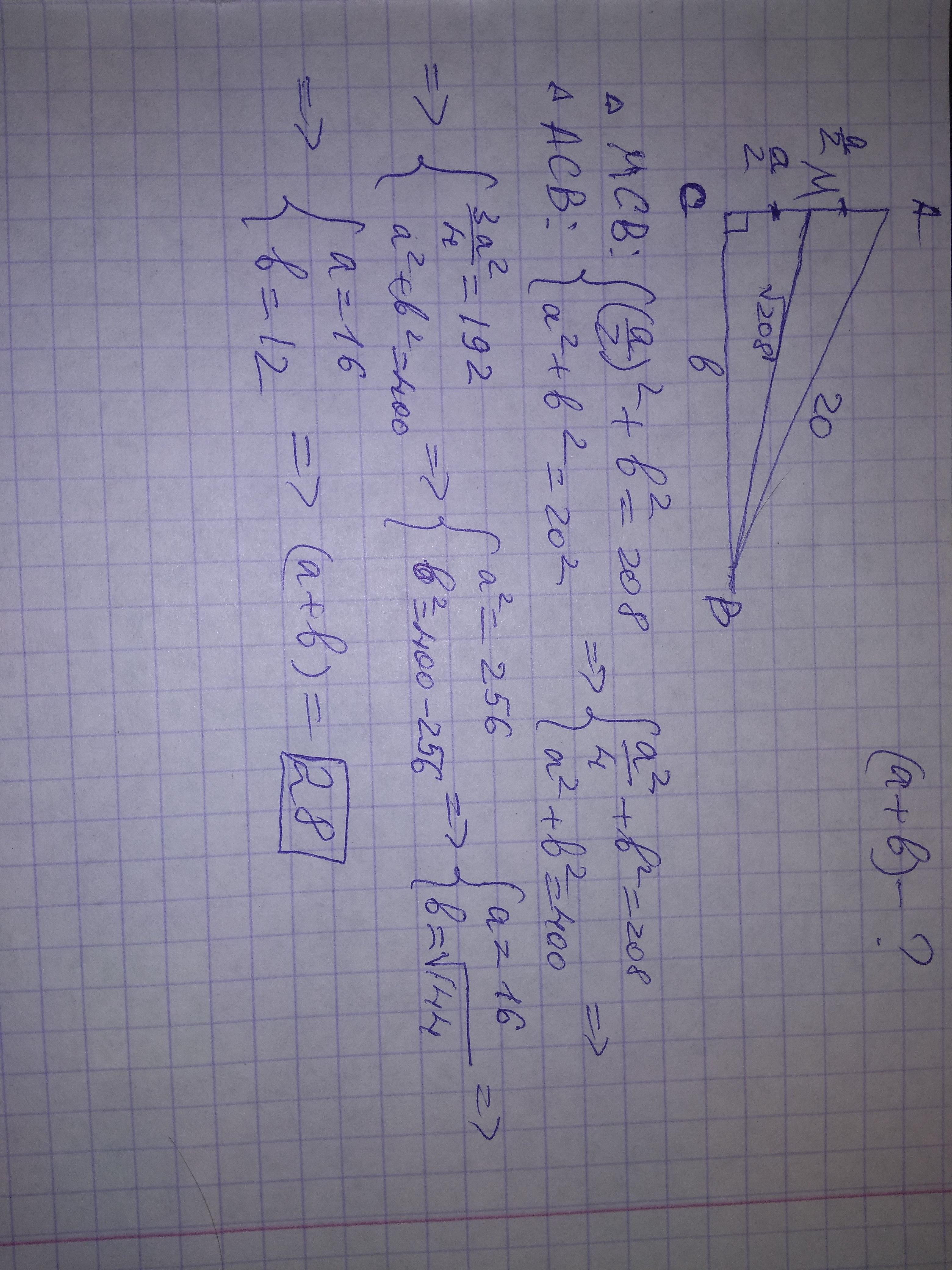 В прямоугольном треугольнике медиана к одному из катетов равно √208, а длина гипотенузы равна 20. Найдите сумму длин катетов треугольника.