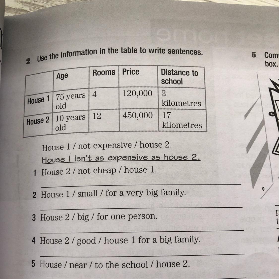 1. House 2 isn’t as cheap as house 1. 2. House 1 is too small for a very big family. 3. House 2 is too big for one person. 4. House 2 is better than house 1 for a big family. 5. House 1 is nearer to the school than house 2.