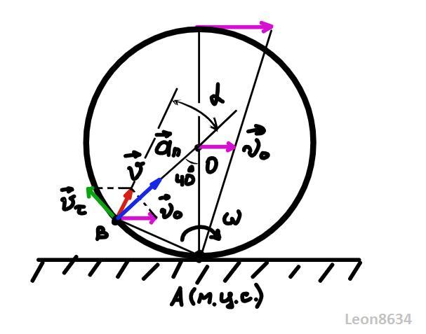 Точка А (где колесо касается земли) является мгновенным центром скоростей. Значит скорость любой точки колеса в данный момент времени направлена перпендикулярно радиус-вектору, проведенному из этой точки в данную. Также и скорость нашей точки B . Её можно разложить на две составляющие - касательную скорость