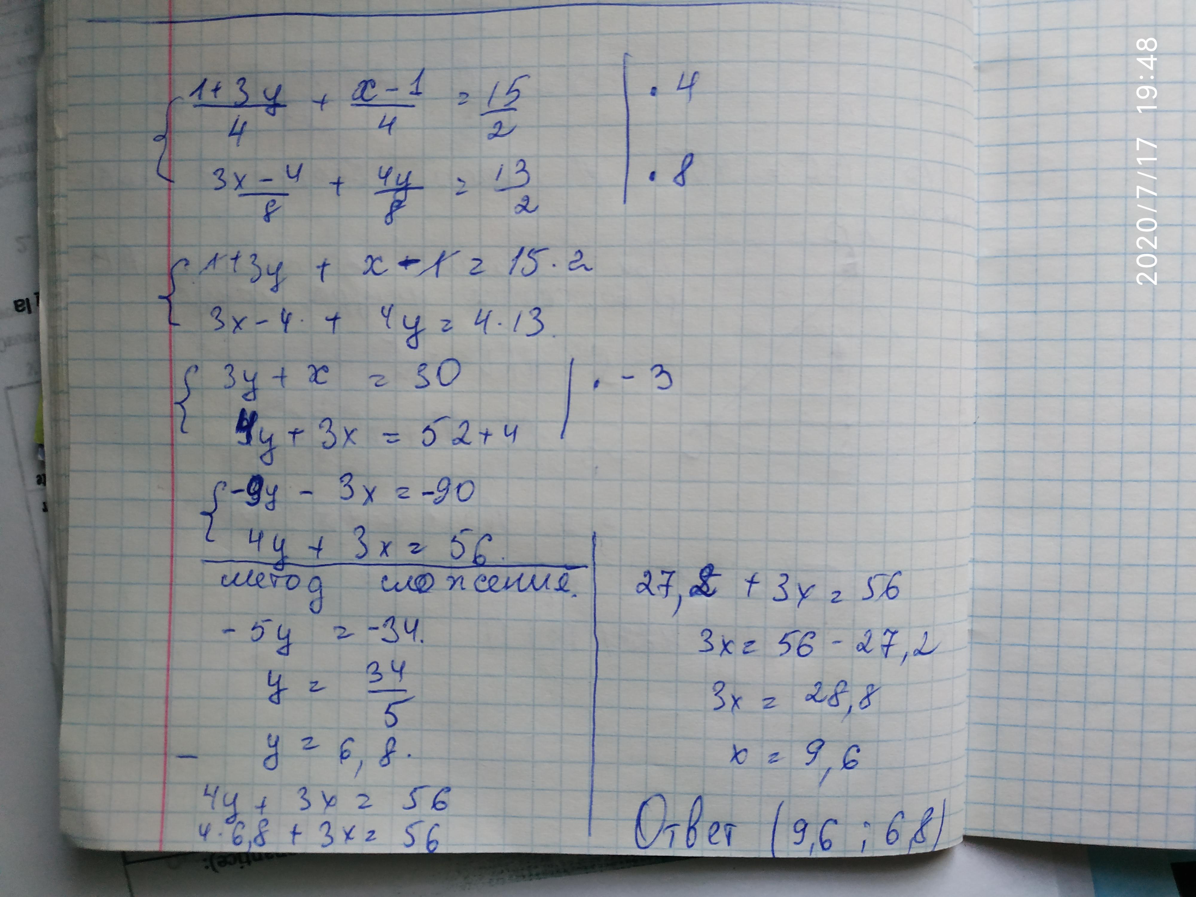 {(3х-4)/8+4у/8=13/2 умножаем на 8
