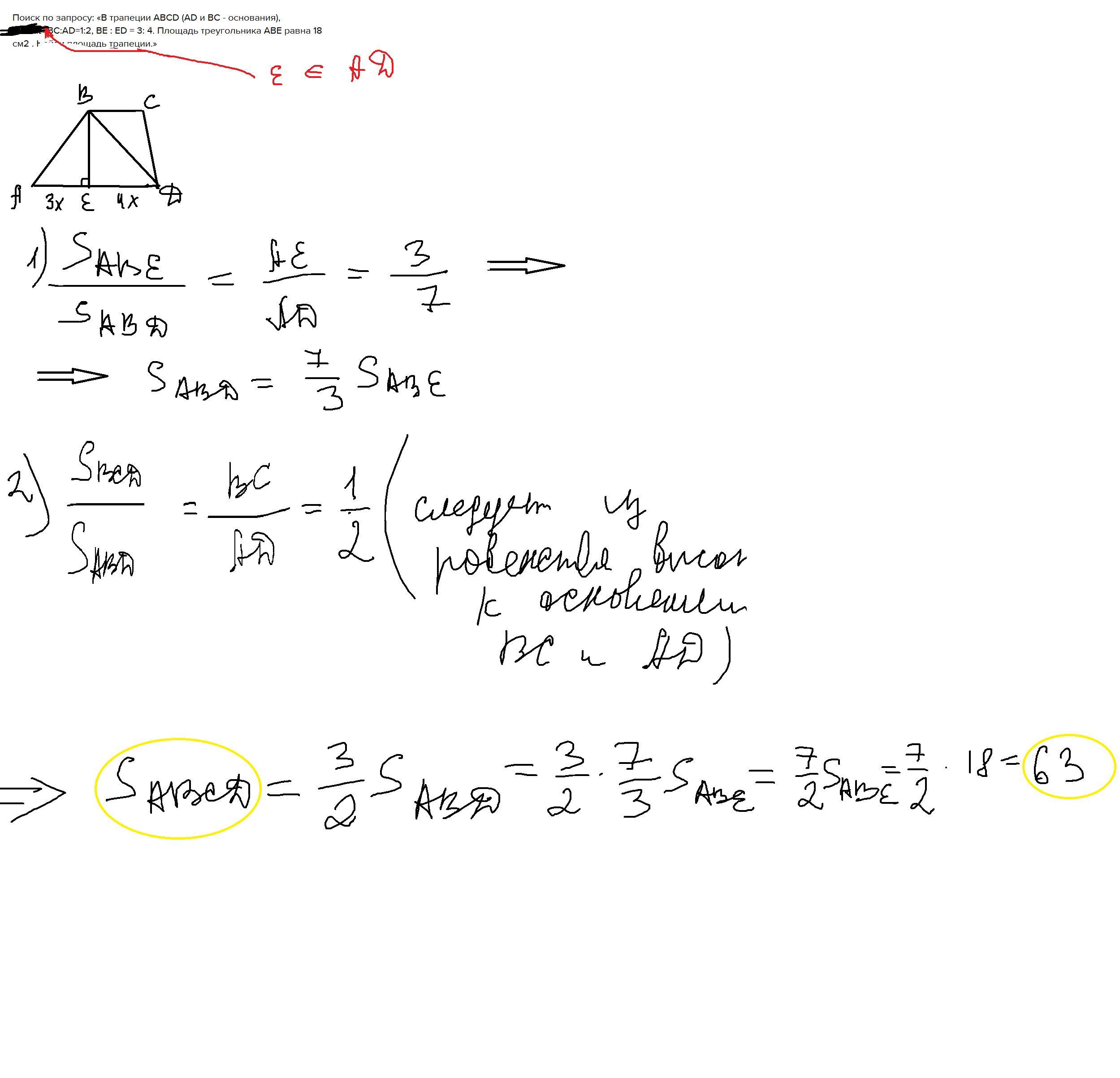 Поиск по запросу: «В трапеции ABCD (AD и BC - основания), BE⊥AD,BC:AD=1:2, BE : ED = 3: 4. Площадь треугольника ABE равна 18 см2 . Найди площадь трапеции.»