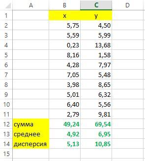 7Как расчитать сумму,среднее и дисперсию в excel при x=5.75;5.59;0.23;8.16;4.28;7.05;3.98;5.01;6.4;2.79 y=4.5;5.99;13.68;1.58;7.97;5.48;8.65;6.32;5.56;9.81;