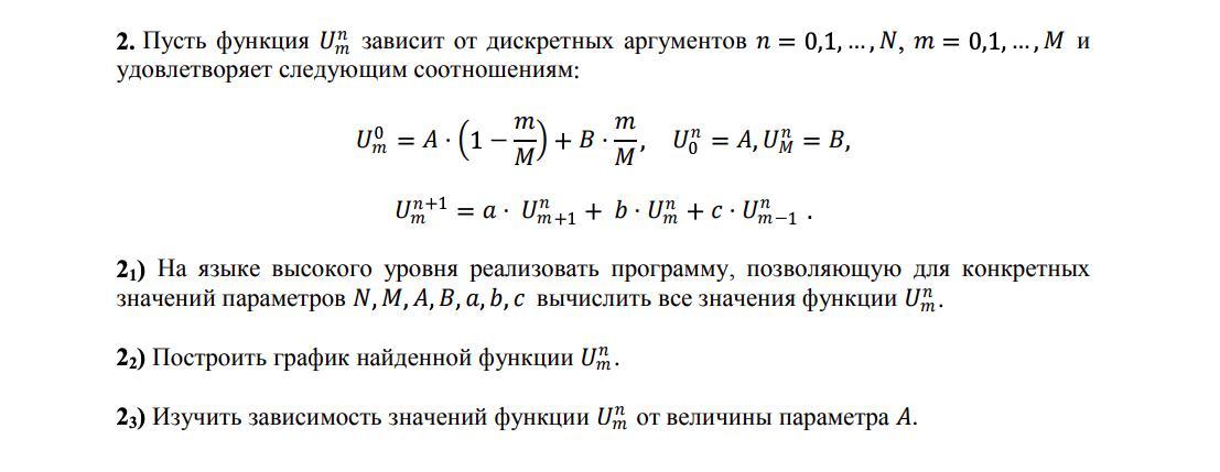 Наша искомая функция U1. Раз это функция от 2 переменных, то это какая-то трехмерная поверхность. Чтоб изучить функцию относительно параметра А нужно прогнать программу с разными значениями А. Есть второй вариант: сразу писать программу для функций U и U1 от трех переменных (m,n,A).