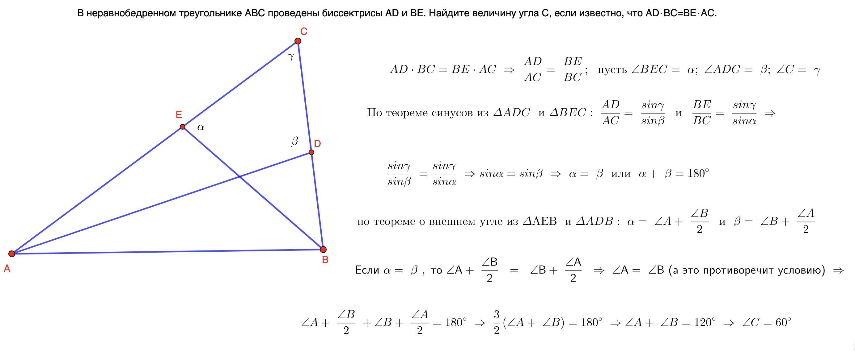 В неравнобедренном треугольнике ABC проведены биссектрисы AD и BE. Найдите величину угла C, если известно, что AD⋅BC=BE⋅AC.