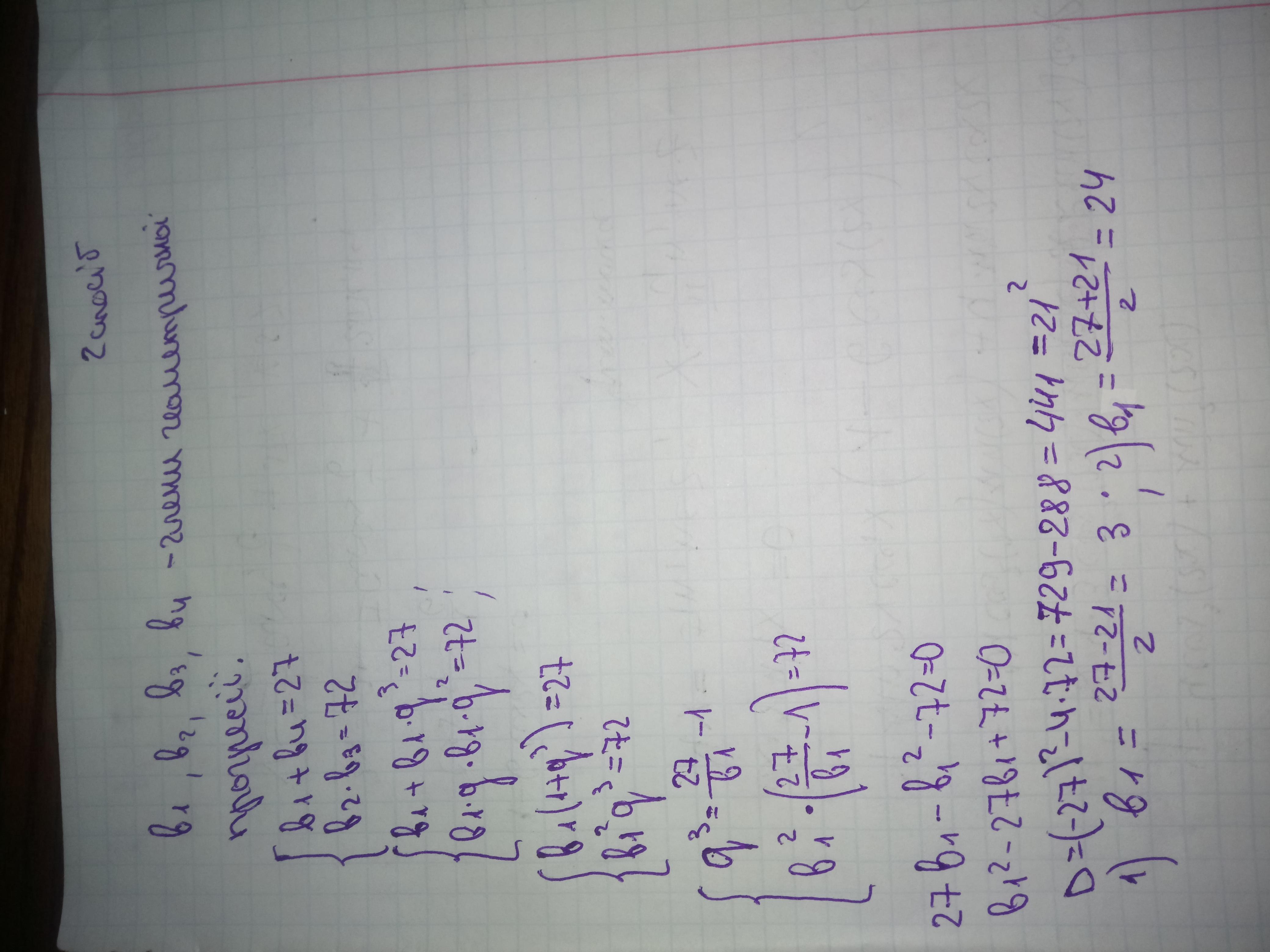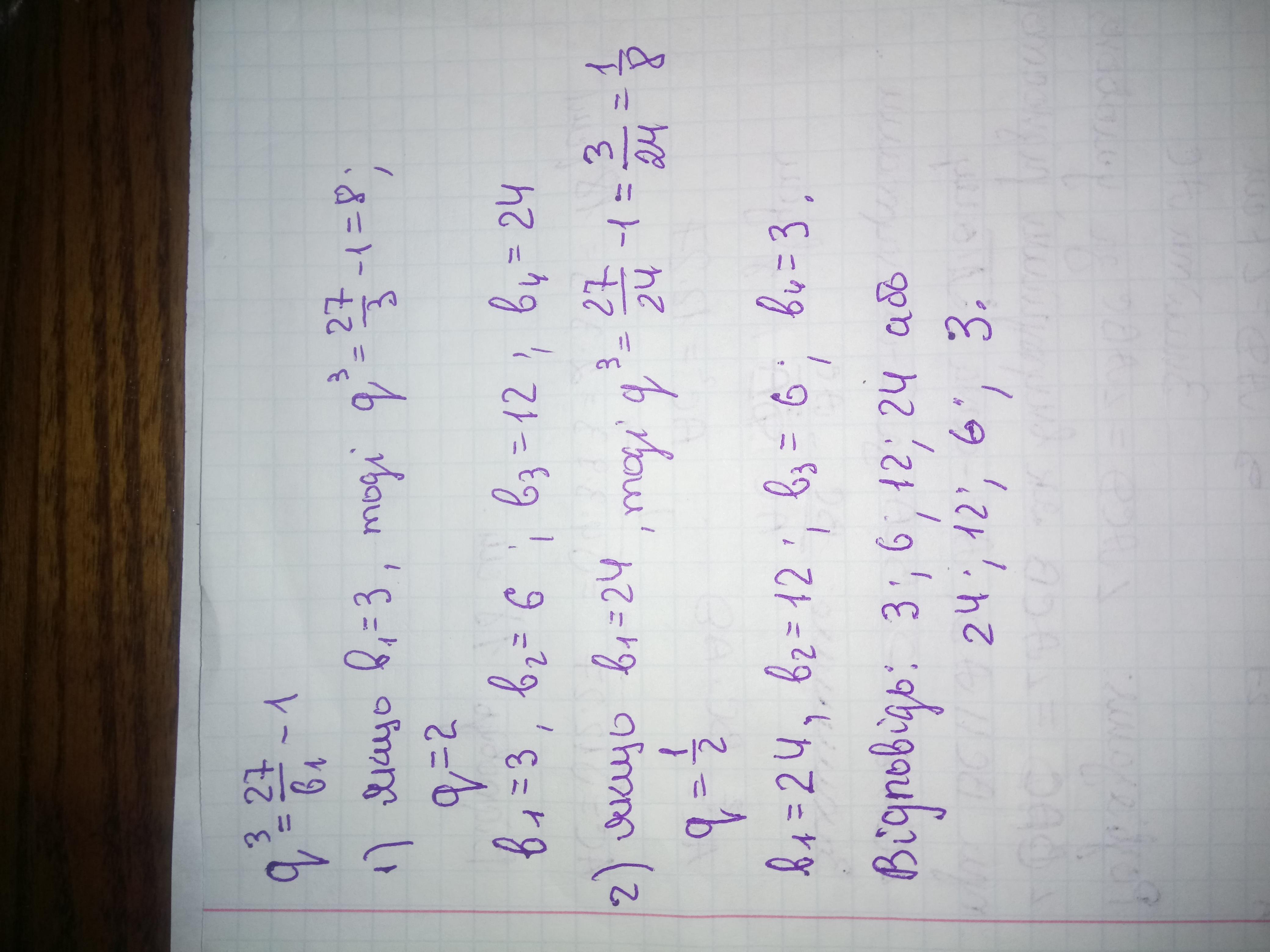2) q³=2/16=1/8;q=1/2; а=27/(9/8)=24; искомые числа 24; 12; 6;3