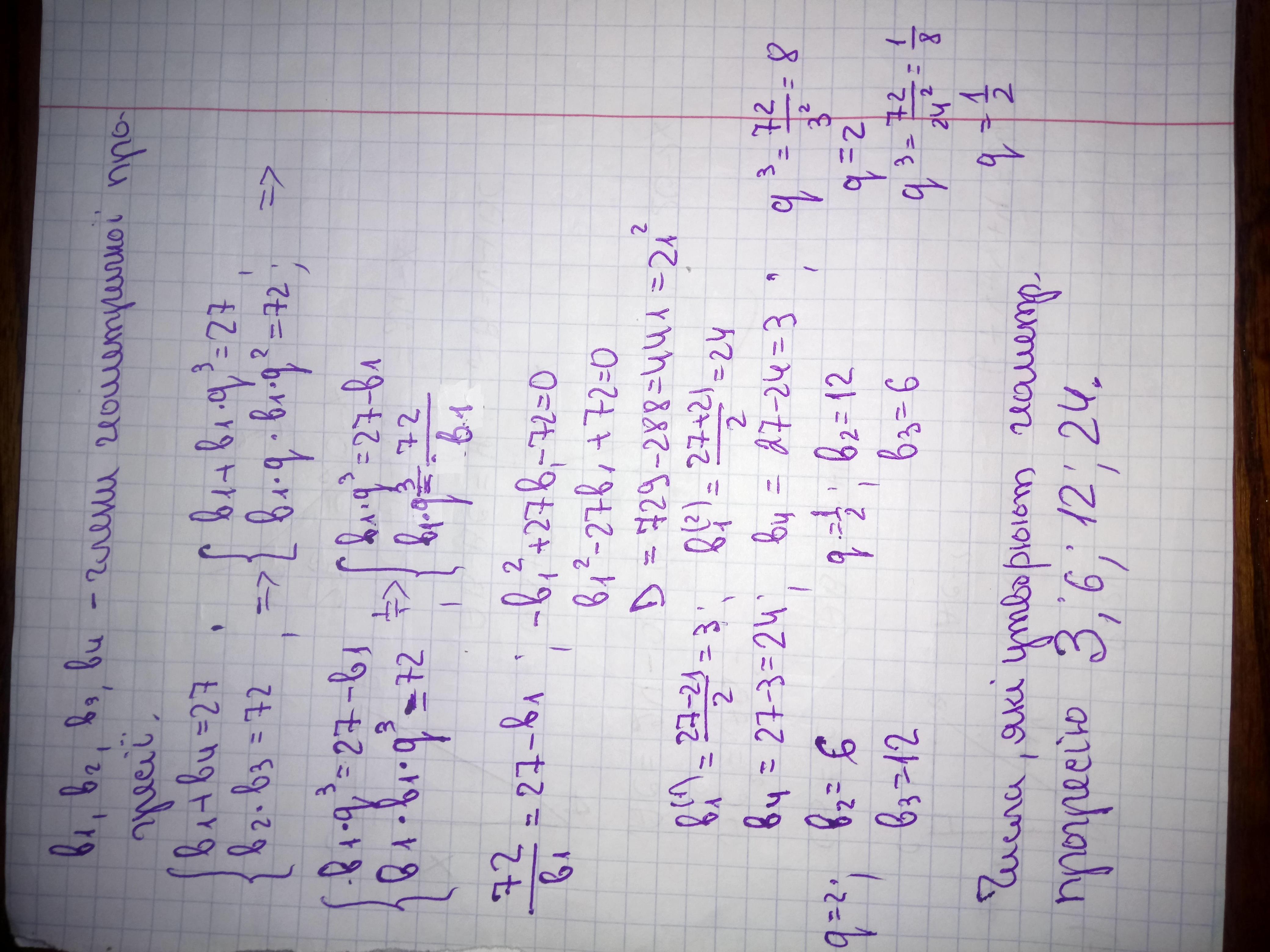 Знайти чотири числа, що утворюють геометричну прогресію, у якій в сума крайніх членів дорівнює 27, а добуток середніх дорівнює 72.