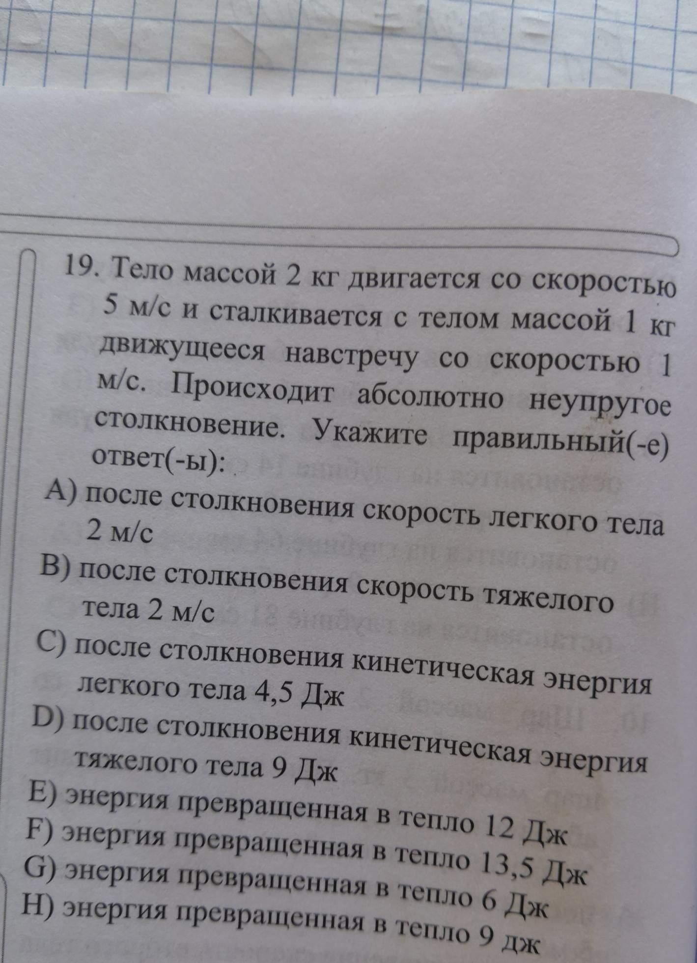 Вот это странно, потому-что после столкновения легкое и тяжелое тело слипаются и движутся как одно целое со скоростью 3 м/с, если масса тяжелого тела 2 кг, то его кинетическая энергия 2*3^2/2=9 Дж