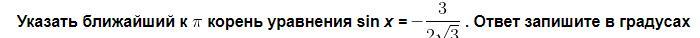 12) Указать ближайший к \pi корень уравнения sin x = -3/2√3 . Ответ запишите в градусах