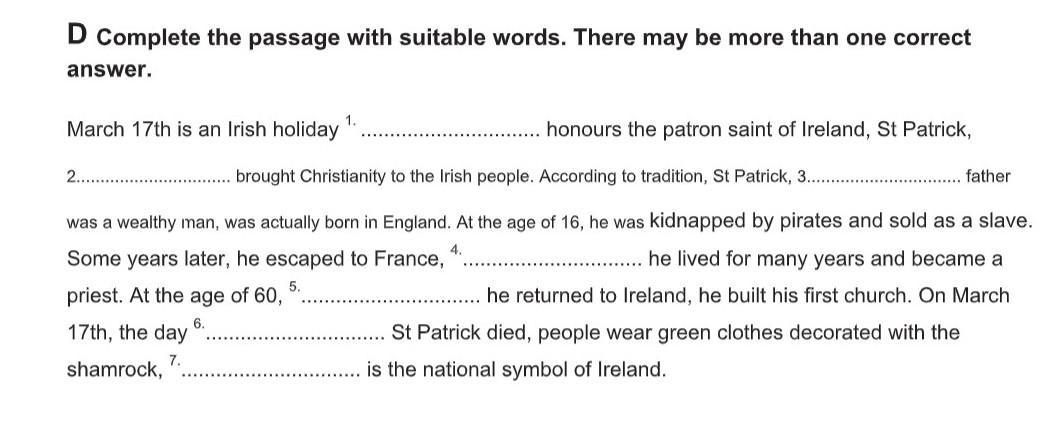 March 17th is an Irish holiday 1 in honours the patron saint of Ireland, St. Patrick, 2 who brought Christianity to the Irish people. According to tradition, St. Patrick, 3 his father was a wealthy man, was actually born in England. At the age of 16, he was kidnapped by pirates and sold as a slave. Some years later, he escaped to France, 4 where he lived for many years and became a priest. At the age of 60, 5 when he returned to Ireland, he built his first church. On March 17th, the day 6 when St. Patrick died, people wear green clothes decorated with the shamrock, 7 a shamrock is the national symbol of Ireland.