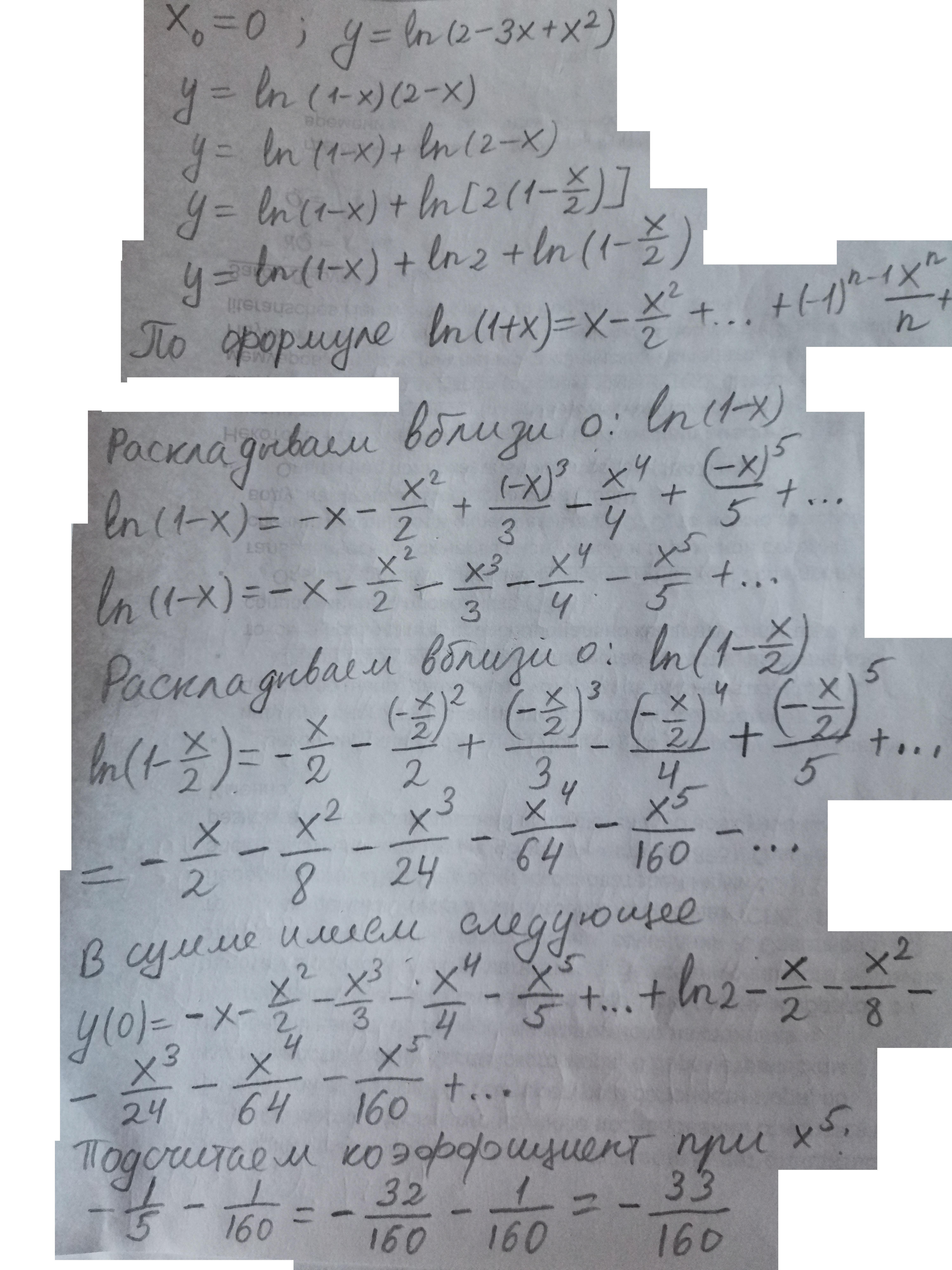 Пользуясь формулой Маклорена найти коэффициент при (x-x0)^5 в разложении f(x) в окрестности x0=0, y=ln(2-3x+x^2). Нужно полное решение, заранее спасибо! (Мат.анализ 1й курс)